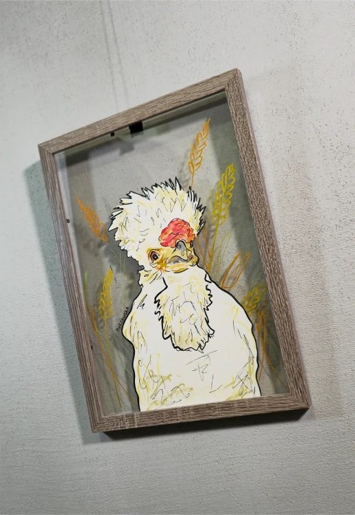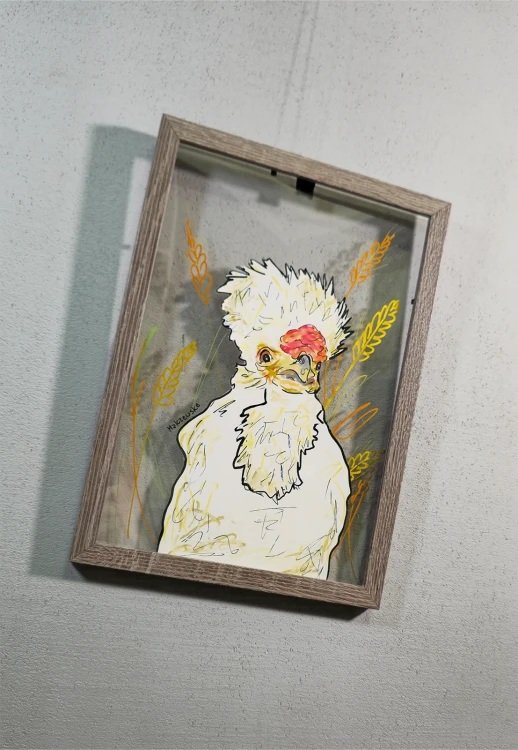 Technika: obraz częściowo transparentny, tło zależy od tego gdzie go powiesisz. Kogut - markery akrylowe na papierze.