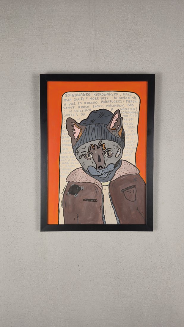 Obraz został wykonany farbami akrylowymi na papierze w formacie A3. Każdy szczegół malowany ręcznie – od czapki po pełną autoironii opowieść w tle.