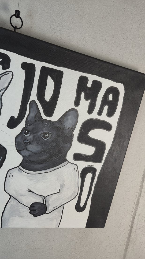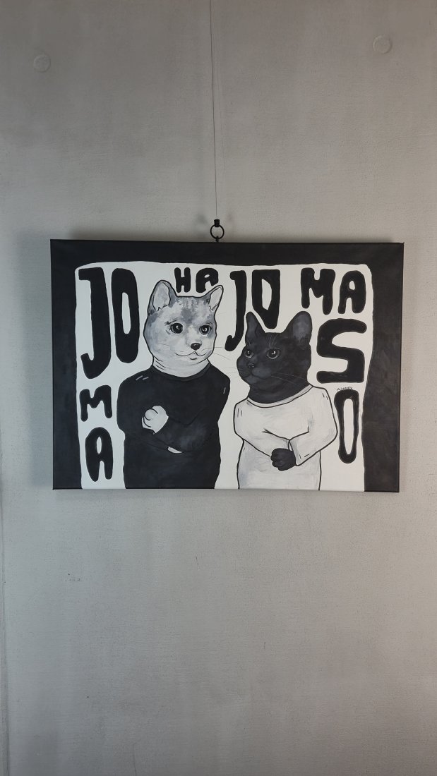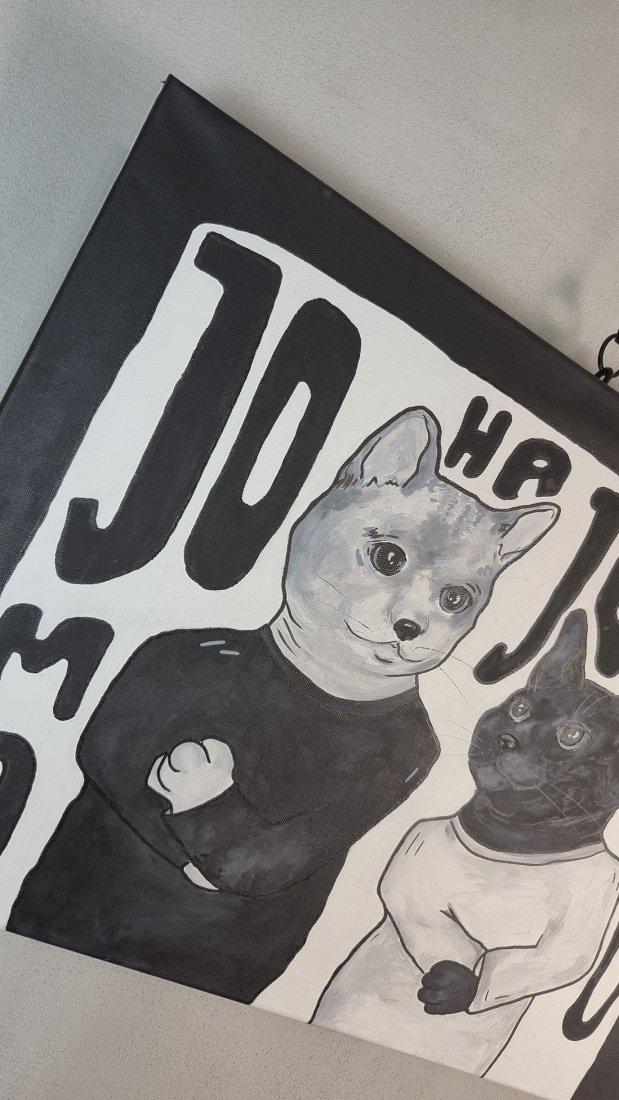 Oryginalny obraz akrylowy przedstawiający dwa koty stylizowane na kultową okładkę płyty zespołu Modern Talking. Praca utrzymana w czarno-białej, kontrastowej kolorystyce, z wyraźnym konturem i lekko humorystycznym, ilustracyjnym charakterem. To połączenie popkultury, sztuki współczesnej i kociej estetyki, które przyciąga wzrok i nadaje wnętrzu wyjątkowego charakteru.