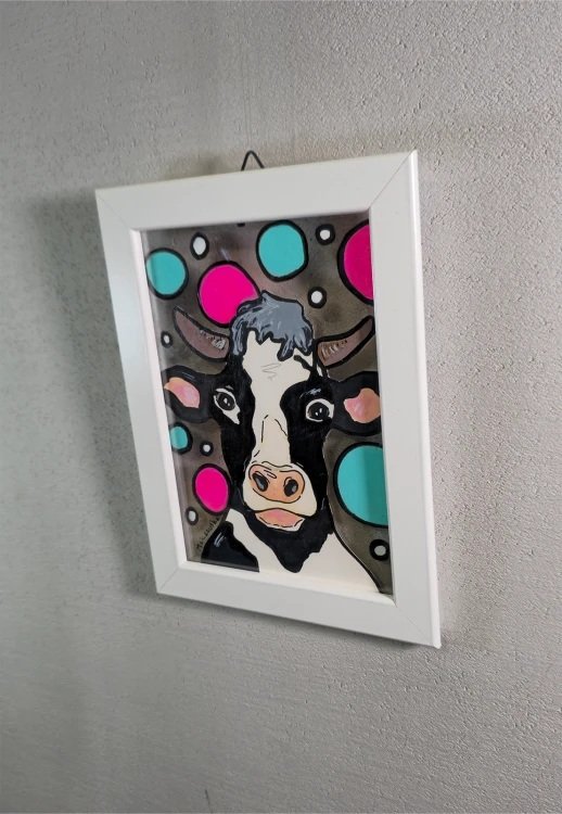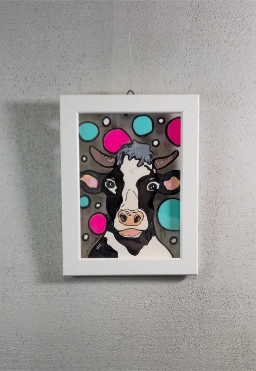 Technika: obraz częściowo transparentny, tło zależy od tego gdzie go powiesisz. Krowa - akryl na papierze.