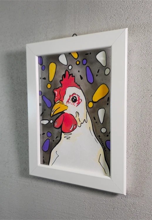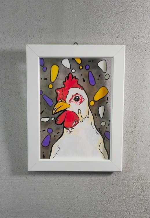 Technika: obraz częściowo transparentny, tło zależy od tego gdzie go powiesisz. Kura - akryl na papierze.