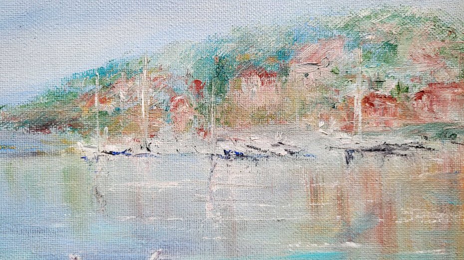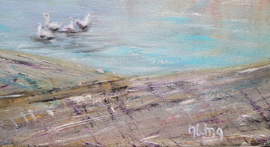 Obraz ręcznie malowany farbami olejnymi na płótnie. Płótno jest naciągnięte na sosnową blejtramę i ma zamalowane boki w kolorystyce obrazu, dzięki czemu nadaje się do powieszenia na ścianę bez oprawienia w ramę.