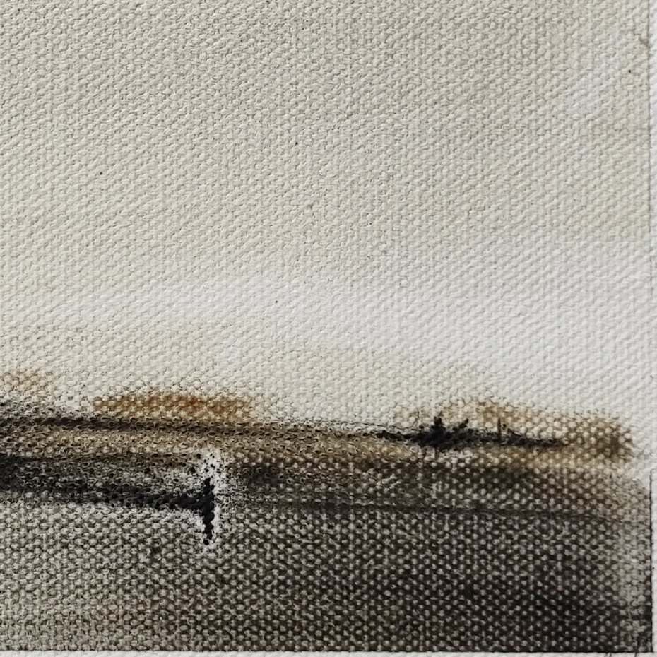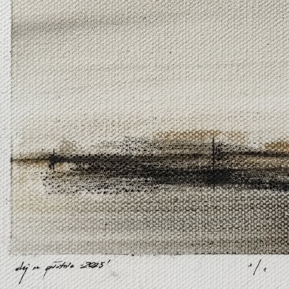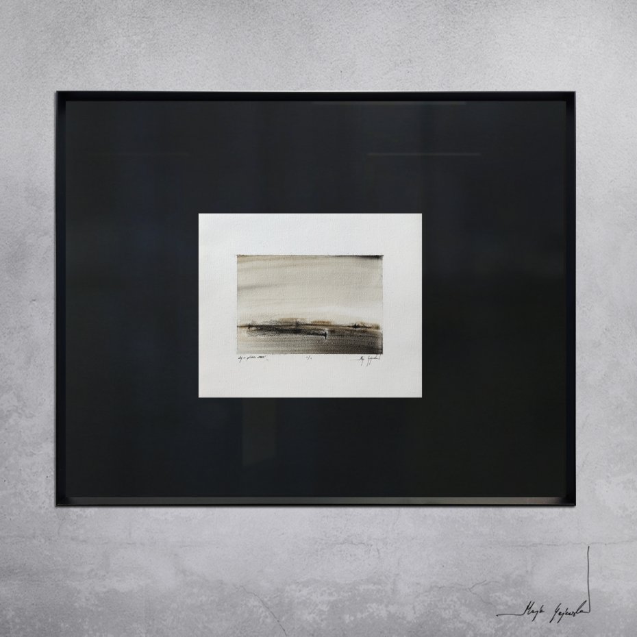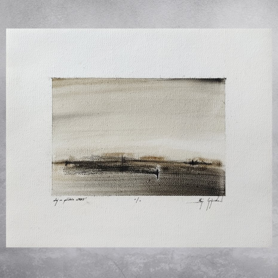 Poziomy pejzaż przywołujący na myśl kadry widziane z okien jadącego samochodu lub pociągu. Rzeczywistość dynamiczna, nieuchwytna i niedopowiedziana.