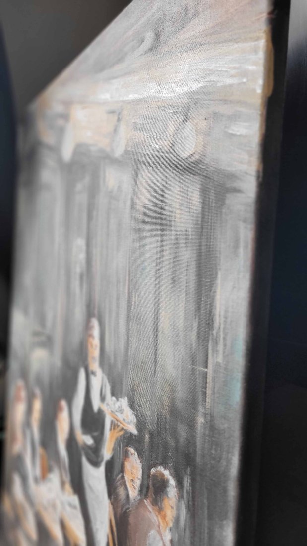 Płótno jest naciągnięte na sosnową blejtramę i ma zamalowane boki w kolorystyce obrazu, dzięki czemu nadaje się do powieszenia na ścianę bez oprawienia w ramę.