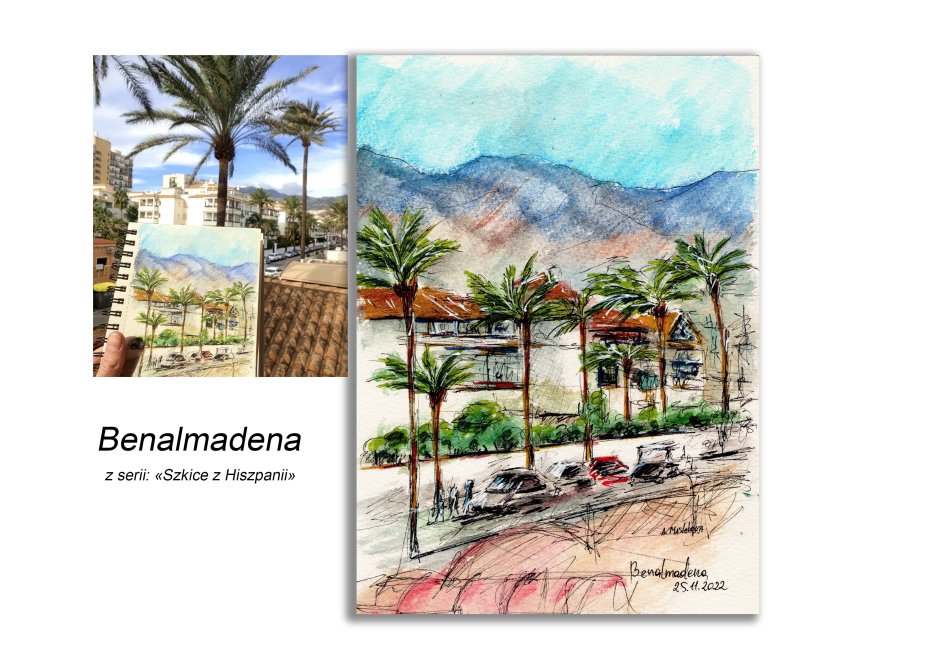 Obraz ręcznie malowany, wykonany w technice mieszanej; na białym, wysokogatunkowym papierze.