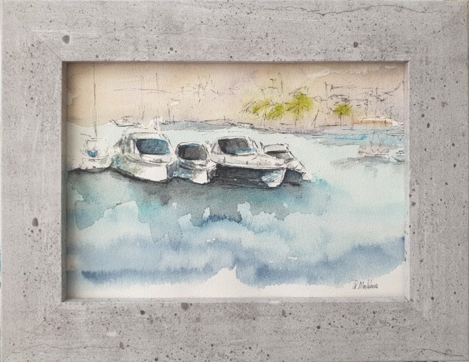 Obraz ręcznie malowany, wykonany w technice mieszanej; na białym, wysokogatunkowym papierze.