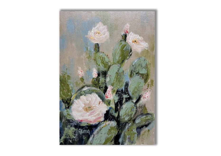 Obraz ręcznie akrylowy na grubym kartonie, przedstawiający kompozycję kaktusów z delikatnymi, białymi kwiatami. Obraz charakteryzuje się bogatą teksturą farby (impasto) i żywą kolorystyką. To idealny dodatek do nowoczesnego wnętrza, salonu, sypialni lub biura, wprowadzający botaniczny akcent.