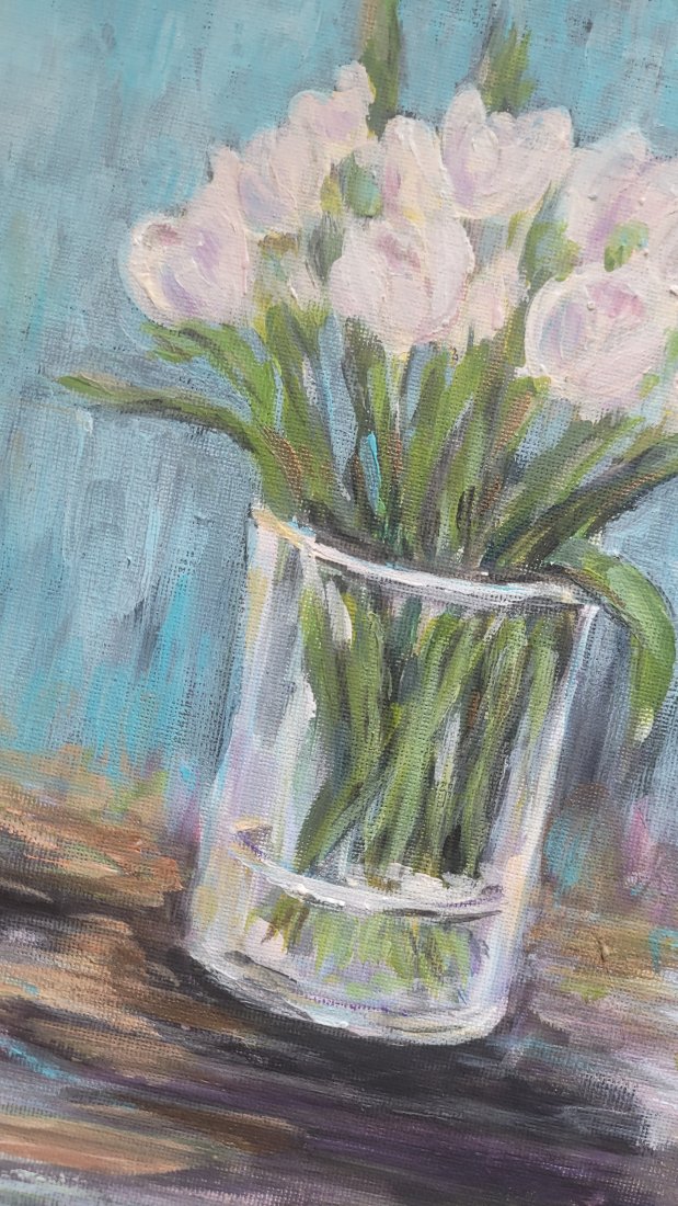 Obraz ręcznie akrylowy na grubym kartonie, przedstawiający tulipany. Obraz charakteryzuje się bogatą teksturą farby (impasto) i żywą kolorystyką. To idealny dodatek do nowoczesnego wnętrza, salonu, sypialni lub biura, wprowadzający botaniczny akcent.