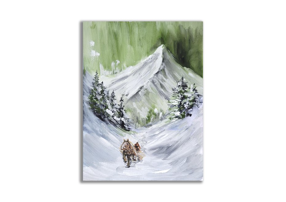 Obraz ręcznie malowany, wykonany w technice mieszanej; na białym, wysokogatunkowym papierze.