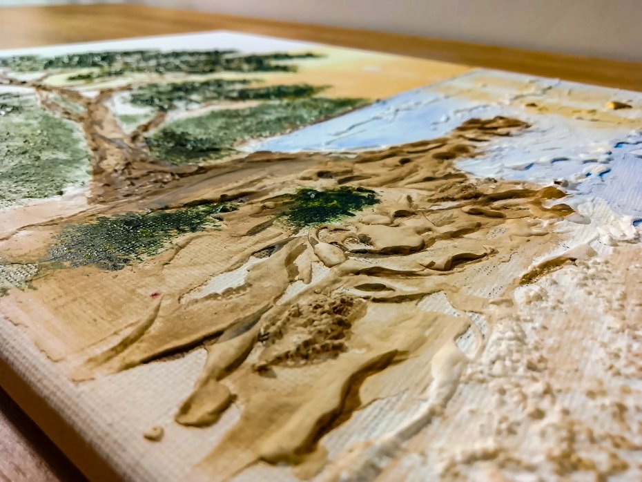 Autentyczność i Pasja: Obraz wykonany techniką mieszaną akrylową, z użyciem pasty strukturalnej, charakteryzuje się ciepłą kolorystyką i subtelną grą cieni, a efekt 3D, powoduje poczucie "ożywienia". Malowniczy pejzaż, który wprowadza do pomieszczenia powiew natury.