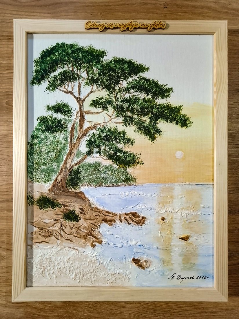 Wyjątkowe Motto, Personalizacja: Nad obrazem znajduje się starannie wykonany, drewniany napis: (1 do wyboru z 3 dostępnych):"Wsłuchaj się w szepty lasu", "Odważ się i wypłyń na głębię" lub "Przemierz świat wzdłuż i wszerz". Każde przesłanie nadaje całości głębokiego, symbolicznego znaczenia – idealne dla miłośnika przyrody, podróżnika, marzyciela lub osoby wkraczającej na nową drogę życia. Wyjątkowy detal nadaje całości poetyckiego charakteru i sprawia, że obraz jest jedyny w swoim rodzaju. Personalizacja czyni go idealnym prezentem na jubileusz, rocznicę, podziękowanie, itp.