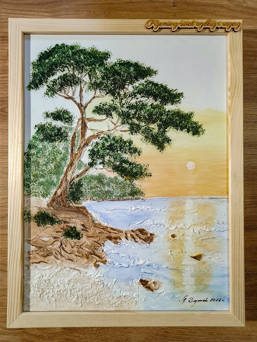 Przenieś się na chwilę w miejsce, gdzie szum fal spotyka się ze spokojem wiekowych drzew. To nie tylko dekoracja, to okno na Twoje własne wspomnienia. Wykonany techniką strukturalną, posiada wyraźną fakturę skał i spienionej wody, co nadaje niezwykłej głębi i realizmu. Obraz duszą malowany, gotowy na prezent pejzaż w ramie. Wprowadzi do wnętrza naturę, spokój, świeżość, pozytywną energię.