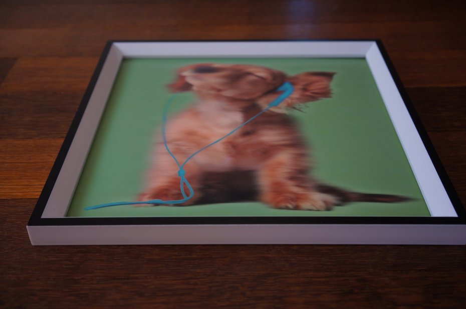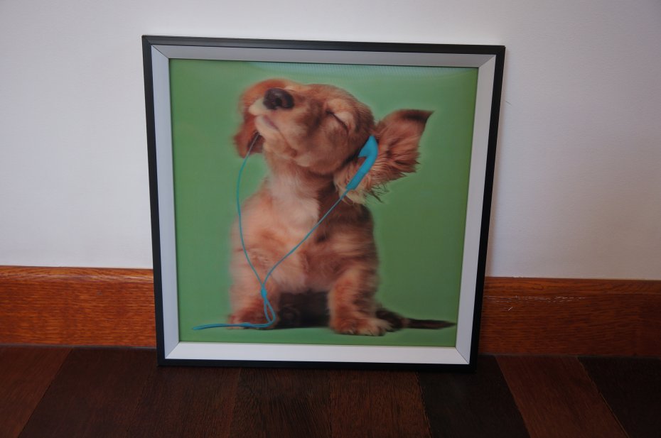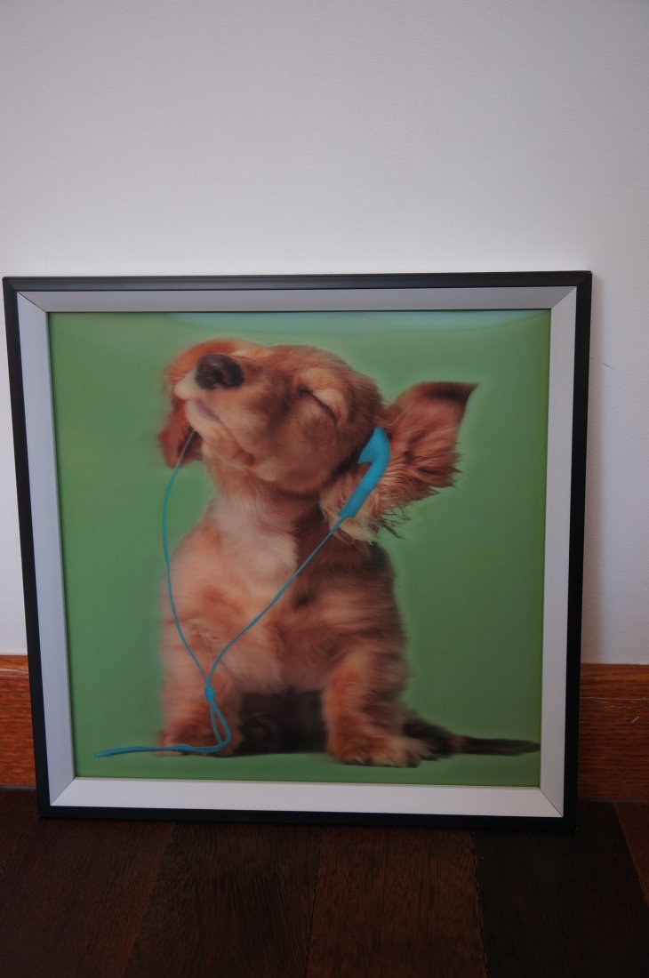Obraz przedstawia pieska “melomana". Obraz 4D oznacza, że obraz, który widzimy na ścianie, nie jest statyczny, a dynamiczny, jak film. To obraz trójwymiarowy, ale z dodatkowym wymiarem czasu, co oznacza, że obraz się zmienia i "rusza", jak w filmie. W zależności pod jakim kątem patrzymy na obrazek, piesek porusza łebkiem. Idealnie będzie pasował w dziecinnym pokoju. Ładna, żywa kolorystyka. Ramka w kolorze biało-czarnym. Stan bardzo dobry.