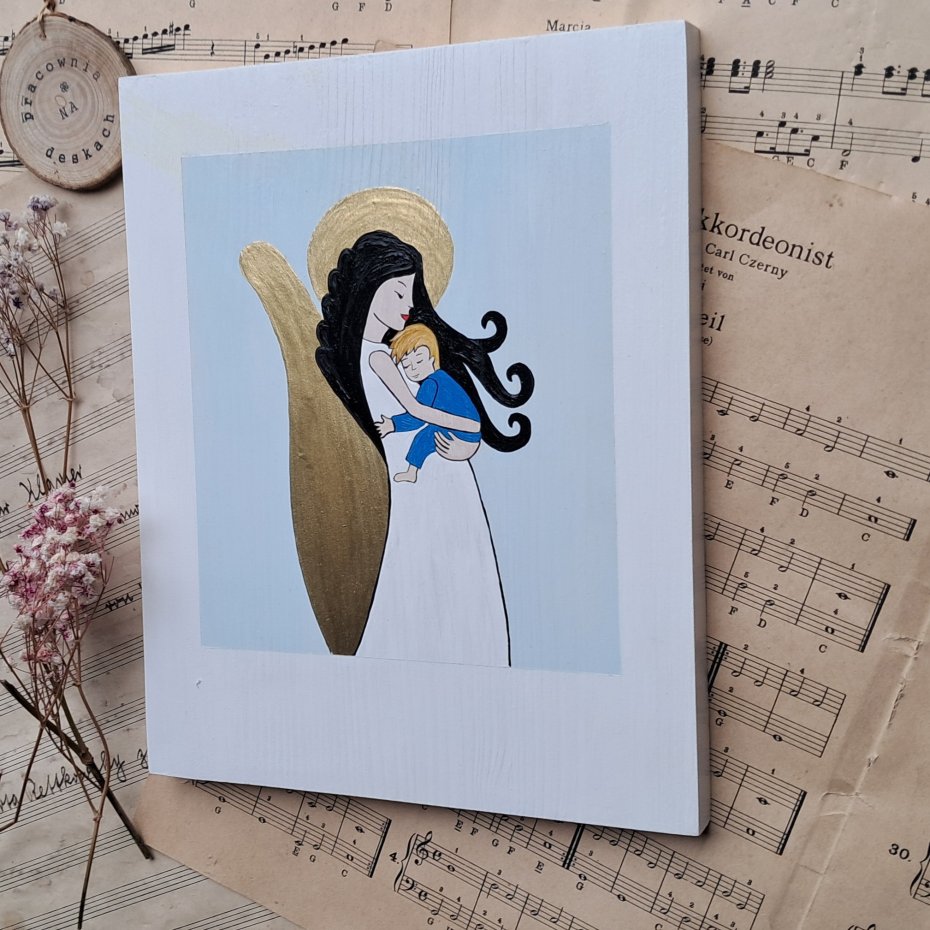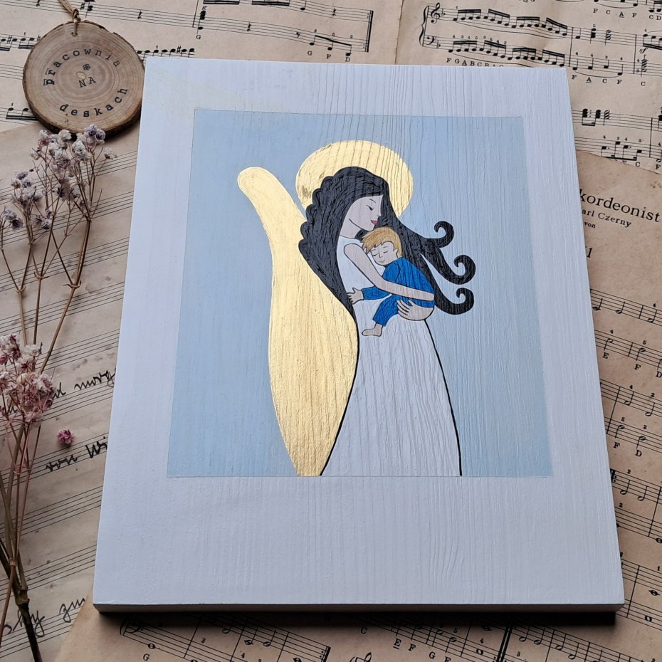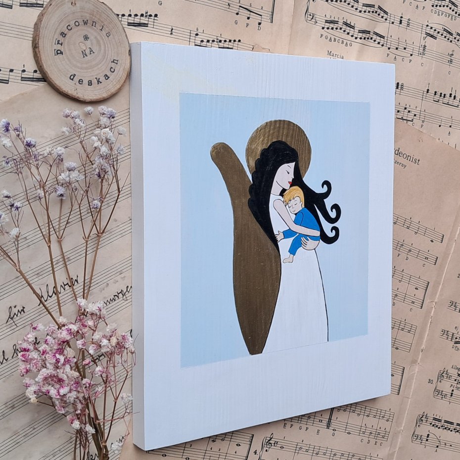 Obrazek malowany na drewnie farbami akrylowymi, do powieszenia na ścianie, polecam na prezent -pamiątkę Chrzest Święty dla chlopca, będzie to prezent na całe życie.