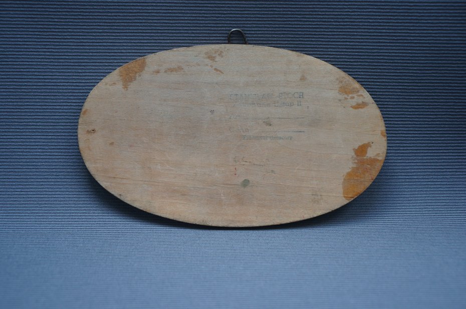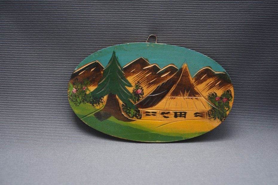 Owalny, mały obrazek na drewnie. Górski widoczek. Vintage. Możliwość zawieszenia na ścianie. Stan bardzo dobry.