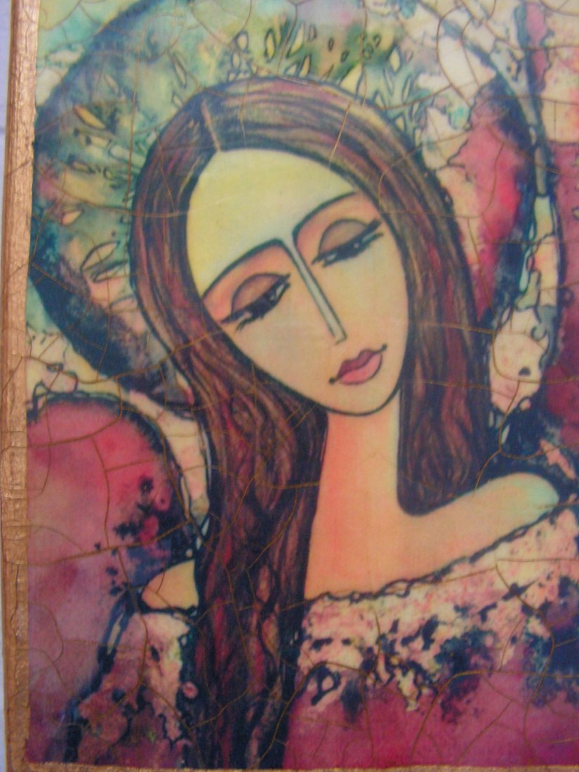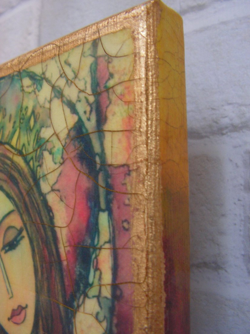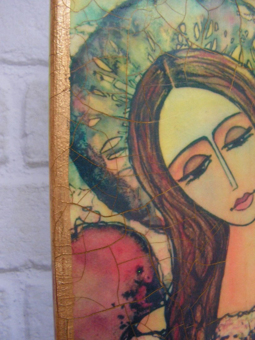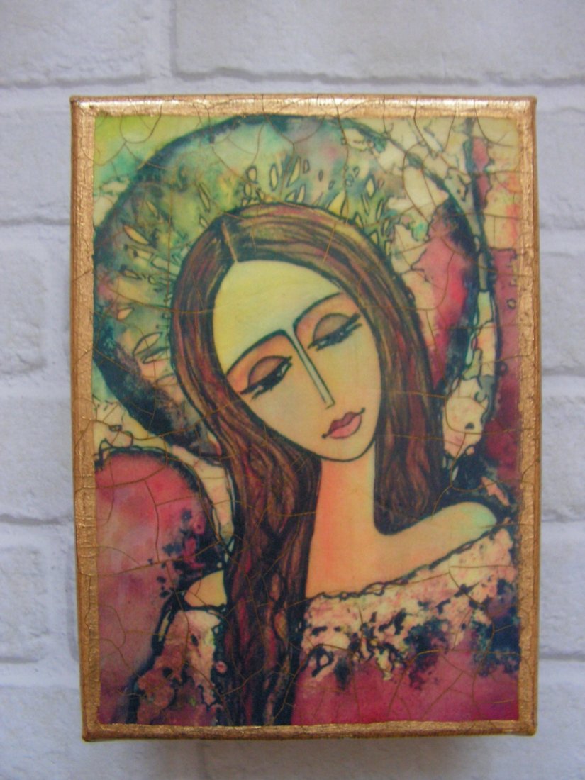 "Anioł Spełnionych Marzeń" - obrazek na płótnie, wykonany metodą decoupage z zastosowaniem złoceń i spękań.