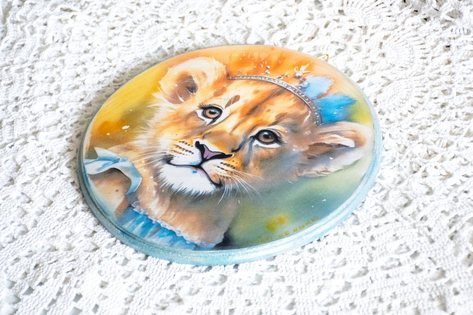 Obrazek został przeniesiony na okrągłą deseczkę z mdf, pięknie frezowaną.