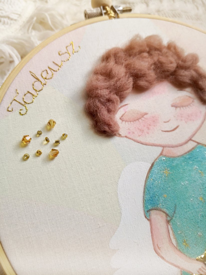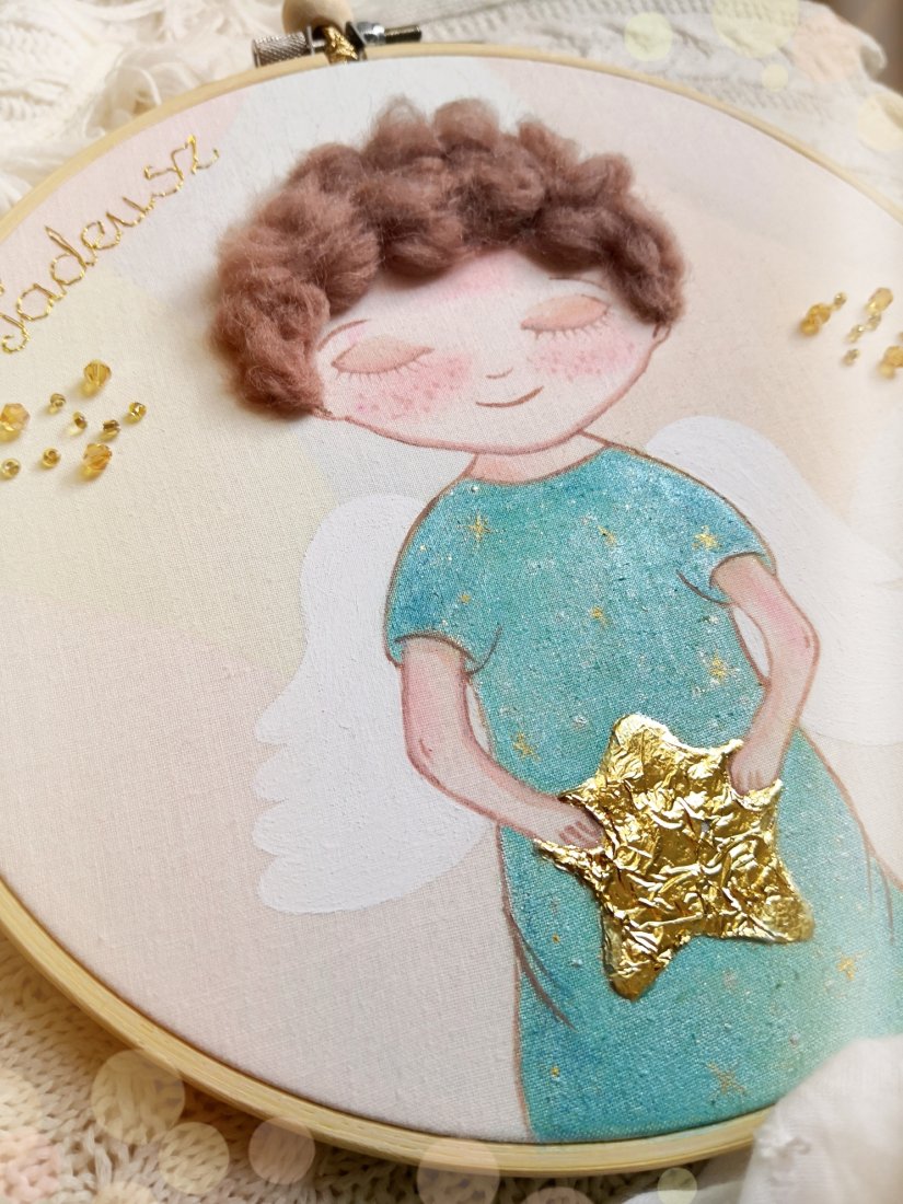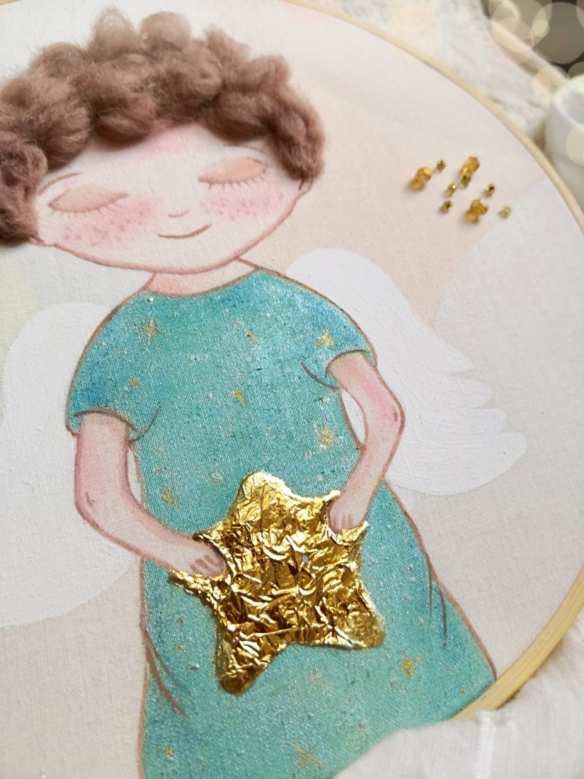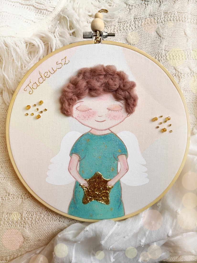 Efekt 3D tworzą włoski aniołka i elementy wykonane hafem ręcznym.