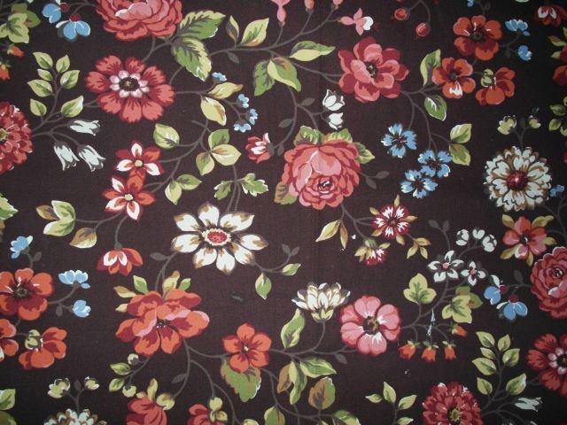 Mały obrus lub szeroki bieżnik. Brązowe tło i na nim ciemno malinowe kwiaty oraz liście w groszkowej zieleni.