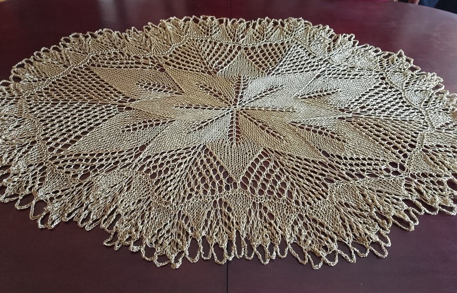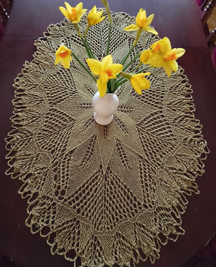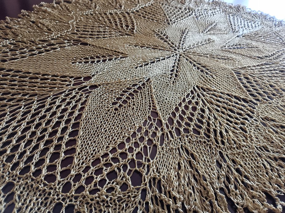 Obrus koronkowy wykonany ręcznie na drutach w kolorze starego złota z połyskiem. Będzie oryginalną i niezwykłą ozdobą mieszkania, ponieważ koronki robione na drutach są wyjątkowo delikatne i mają niecodzienny urok. Dodatkowo wyróżnia je technika wykonania, która obecnie jest rzadkością z uwagi na trudność i pracochłonność.