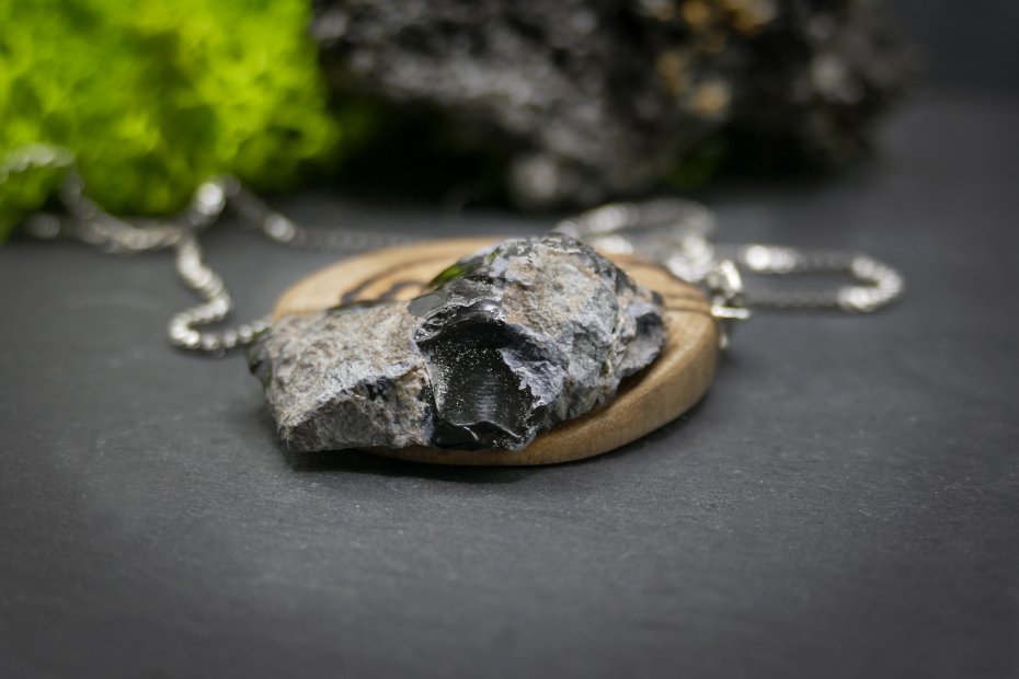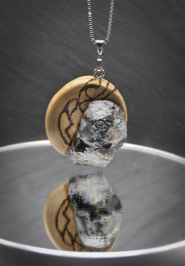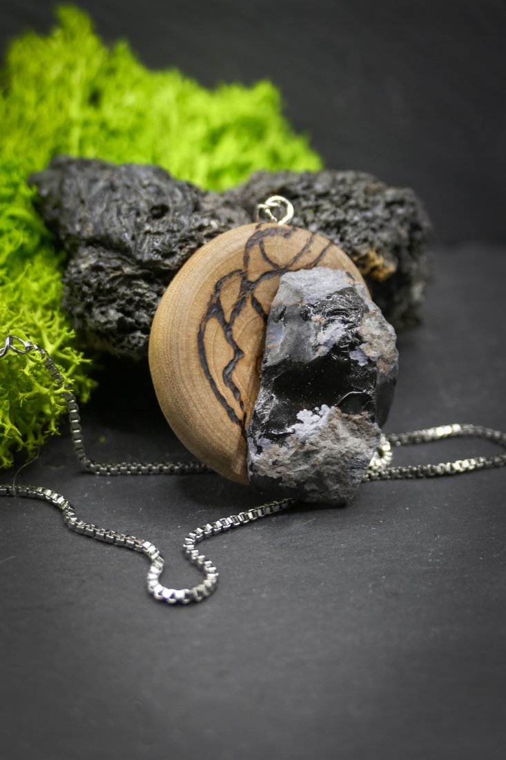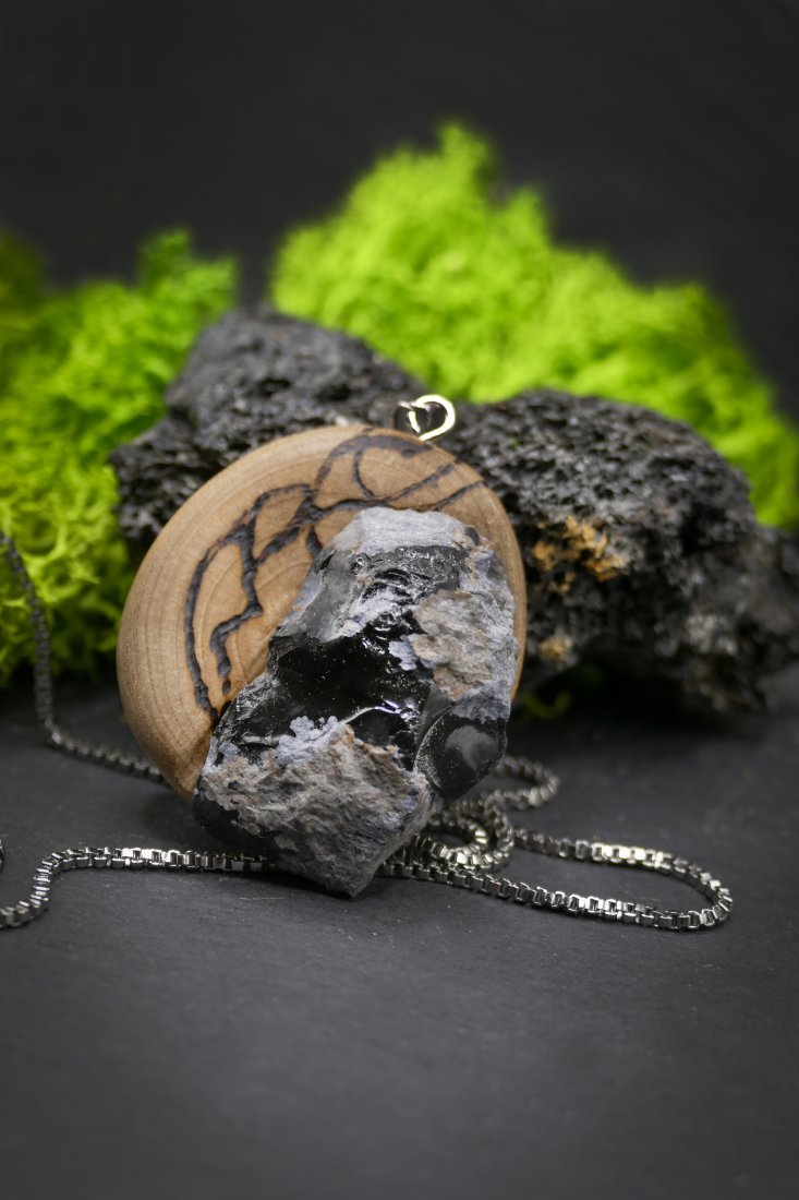 W centrum minimalistycznej formy znajduje się surowy obsydian śnieżny, który tworzy wyrazisty kontrast z ciepłym odcieniem drewna.