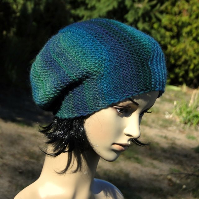 Czapa ( beret) wykonana ręcznie na drutach z rewelacyjnej włóczki prod. hiszpańskiej ( 53% virgin wool, 47% akryl), ciepła, miękka i bardzo przyjemna w dotyku. Świetnie przenikające się odcienie zieleni, ciemnego turkusu, fioletu i niebieskiego. Czapka jest bezszwowa, dzięki czemu można dowolnie układać kolory przy twarzy.