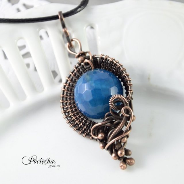Naszyjnik stworzony od podstaw ręcznie z miedzi oraz pięknego agatu w kolorze ciemnego turkusu przypominającego wzburzone morze.