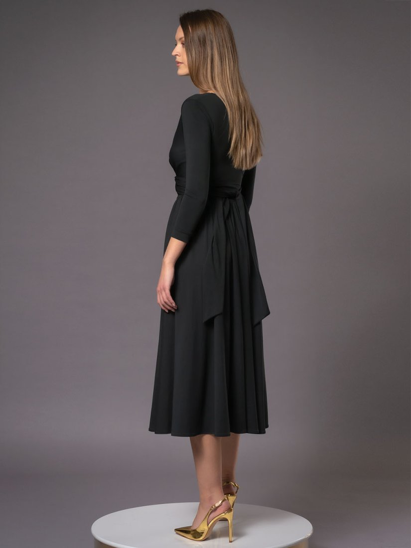 Dół sukienki jest rozkloszowany, długości 7/8 długości, a kieszenie ukryte w bocznych szwach dodają jej praktycznego charakteru. Rękaw kończy się w okolicach łokcia, a całość pięknie wysmukla sylwetkę i zapewnia pełen komfort noszenia.
