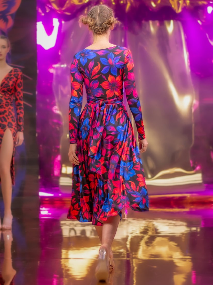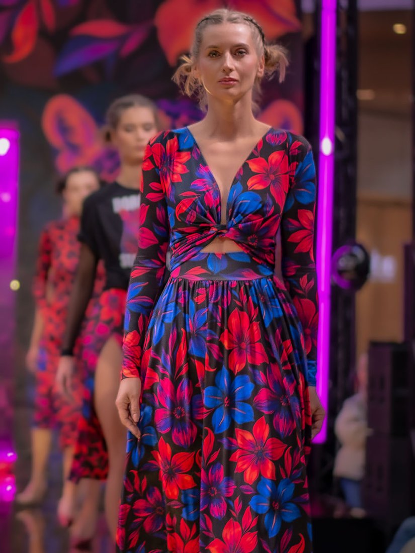 Oferta dotyczy sukienki w kwiaty, kolejne zdjęcia przedstawiają ten sam model (w innym deseniu) ale inne sposoby wiązania, stylizacji.