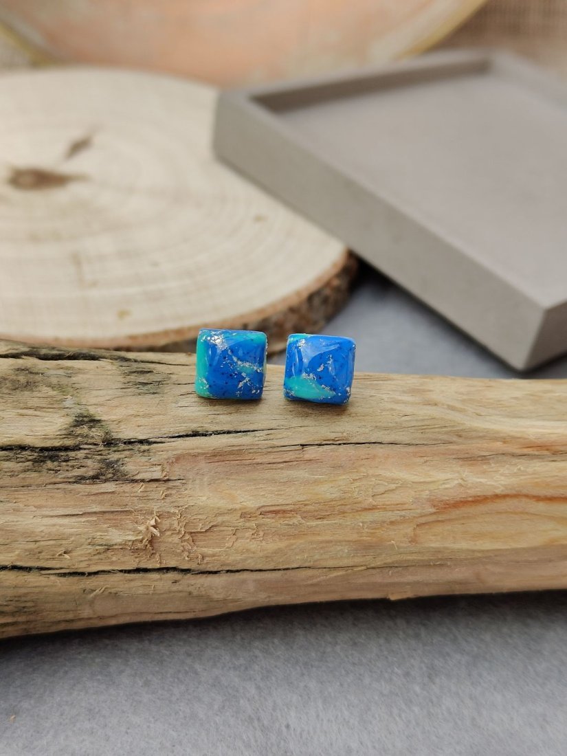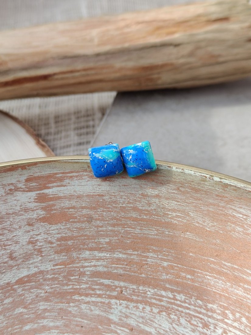 Wyraziste, ręcznie wykonane kolczyki inspirowane kolorami oceanu. Ich intensywny błękit przeplata się z turkusowymi smugami i subtelnymi drobinkami, tworząc efekt głębi i lekkości. Wykonane z glinki polimerowej i pokryte warstwą żywicy, zachwycają gładką, błyszczącą powierzchnią oraz trwałością. Minimalistyczna forma kostki nadaje im nowoczesny charakter, dzięki czemu świetnie sprawdzą się zarówno na co dzień, jak i jako oryginalny akcent stylizacji.