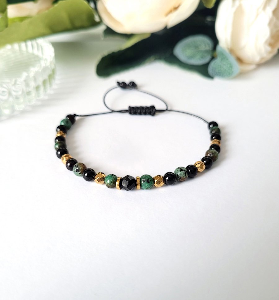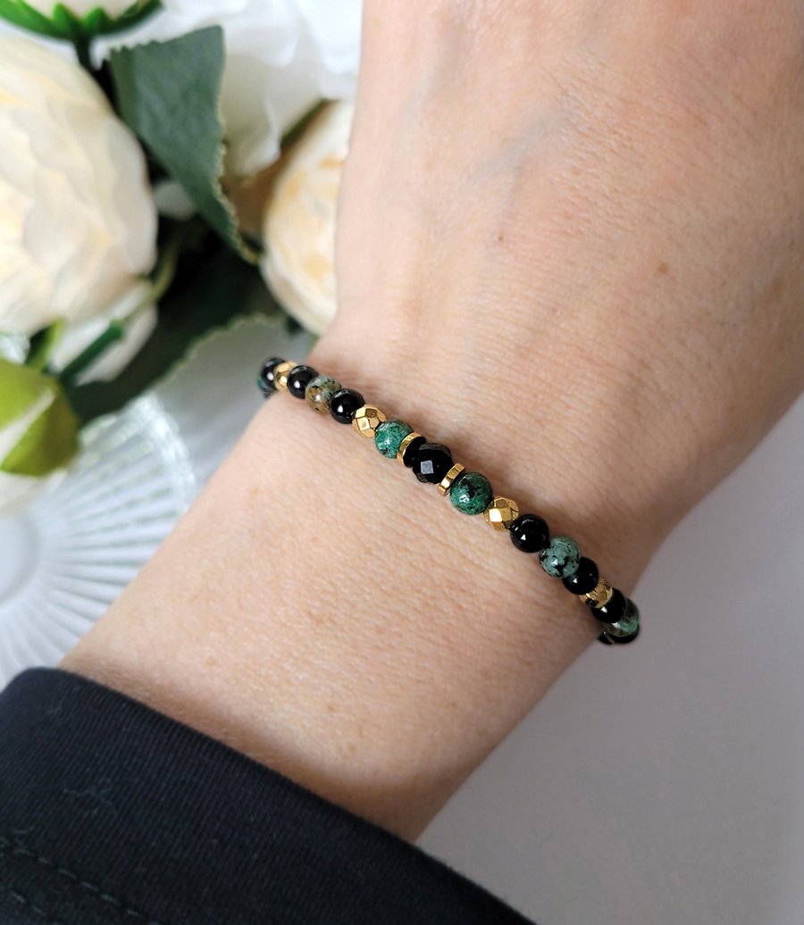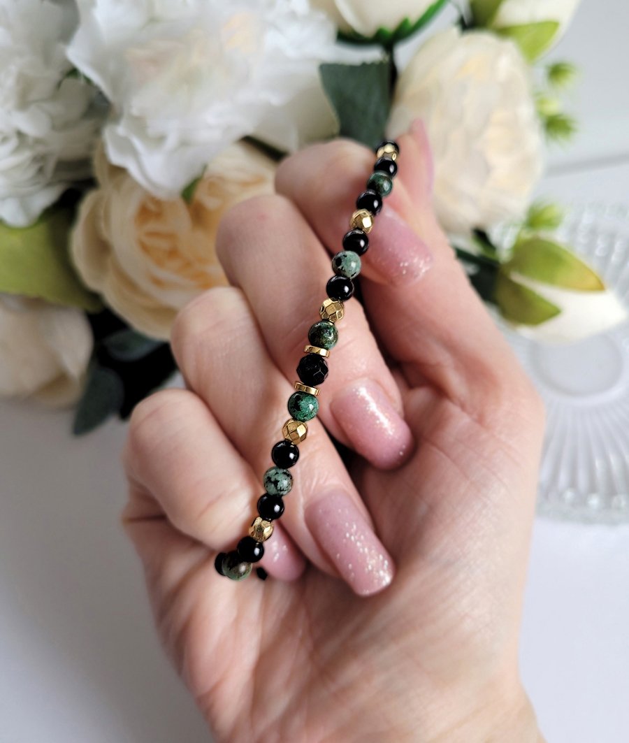 Przepiękna bransoletka zrobiona z kamieni naturalnych: Turmalinu, Onyksu, Turkusu afrykańskiego oraz Hematytu w kolorze złota.