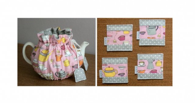 Do kompletu zestaw 4 dwustronnych podkładek pod kubki/filiżanki. W środku bawełniana ocieplina.