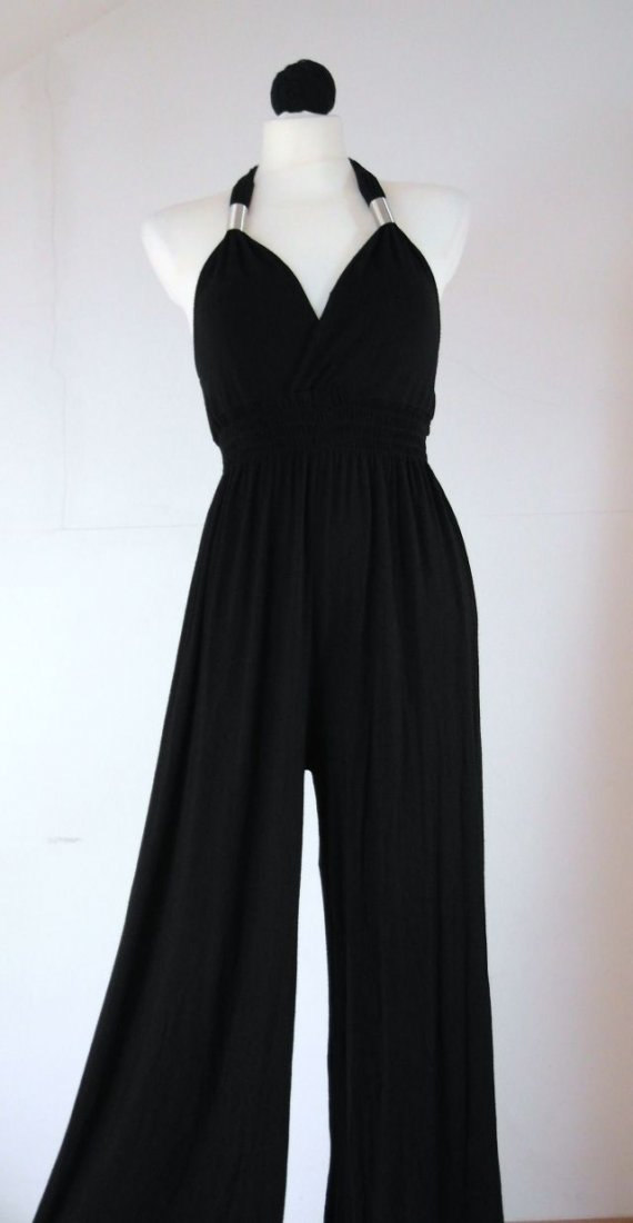 Bardzo elastyczny rozmiarowo - troki wiązane na karku + guma w pasie i na części pleców.Szerokie,tańczące nogawki. Delikatne (ruchome) ozdoby metalowe na ramiączkach.