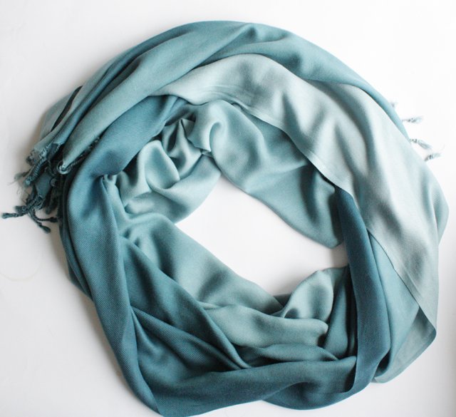 Miękki, wielki szal w przelewanych odcieniach błękitu.