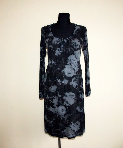 Sukienka holenderskiej marki Tramontana , wykonana prawdopodobnie z dzianiny wiskozowej (brak metki). W pasie i przy dekolcie guma, rękaw raglanowy. Stan bardzo dobry- (na dole dziurka wielkości główki od szpilki, niewidoczna we wzorze). Rozmiar z metki M.