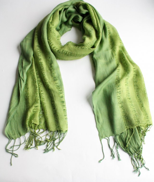 Szal o zróżnicowanej strukturze, w pięknych odcieniach zieleni. Materiał to prawdopodobnie wiskoza.