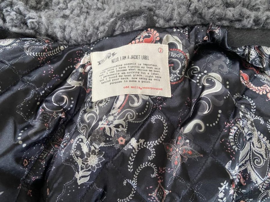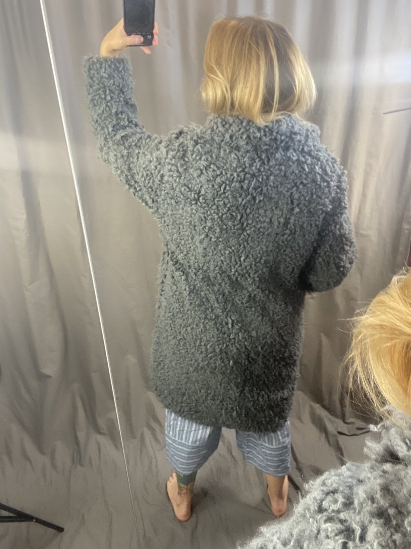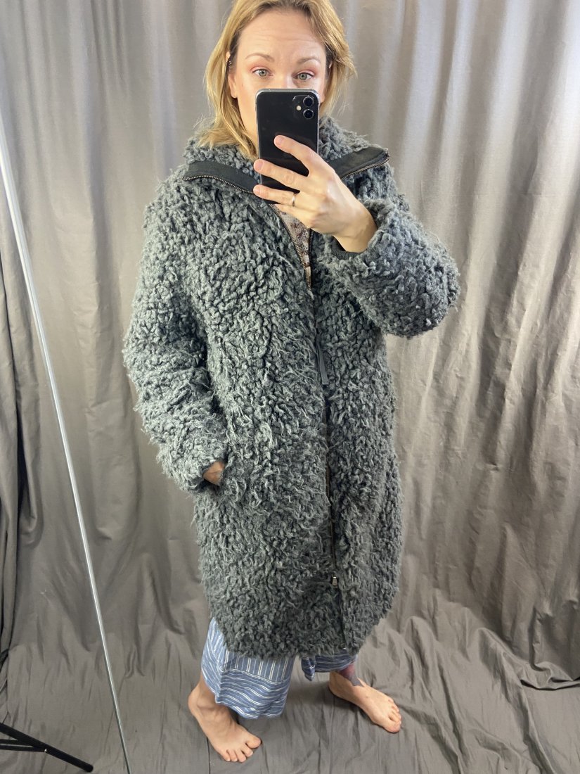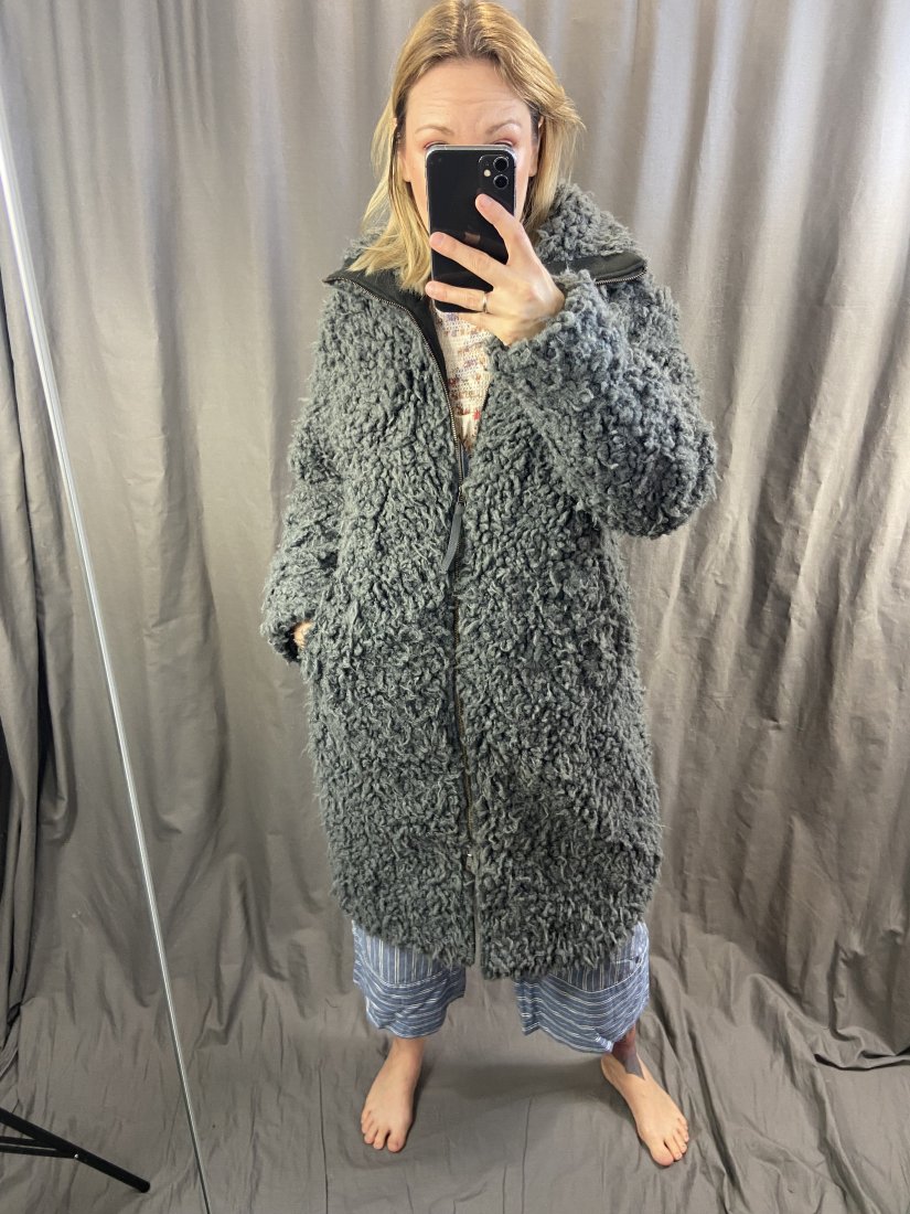 Odd Molly. Shaggy płaszczyk, pikowany od spodu, satynowy od spodu z pięknym wzorem. Ściągacze w pasie. 43% modal, 36% akryl, 21% poliester. Zdjęcia na modelce: