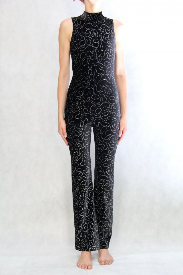 Przepiękny kombinezon wykonany z nylonu z dodatkiem elastyny. Tkanina zdobiona srebrnymi elementami. Stójka. Kombinezon w stanie idealnym.