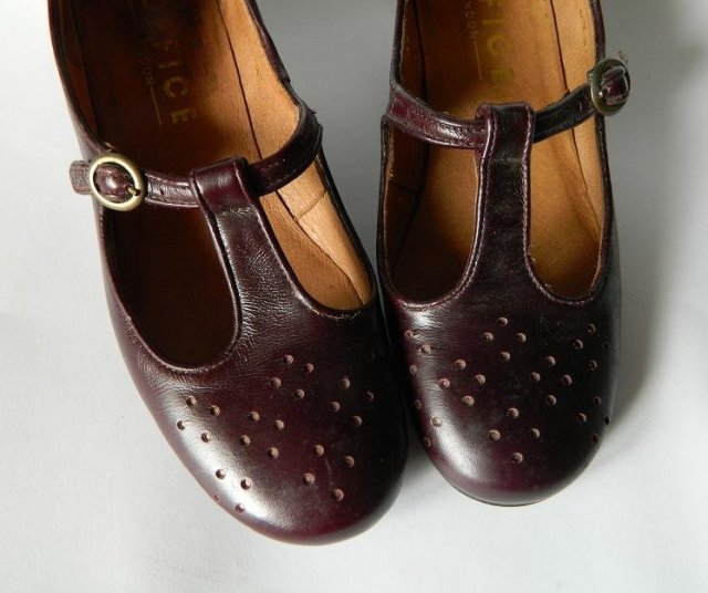 Śliczne czółenka retro OFFICE LONDON. Całe ze skórki naturalnej (również wewnątrz), kolor głęboko bordowy (wino). Zapinany paseczek regulowany gumką (nie trzeba odpinać przy zakładaniu). Niezwykle klimatyczne, idealne do retro stylizacji.