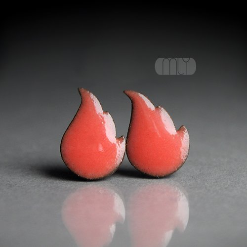 Oryginalne ceramiczne kolczyki w formie sztyftów, ręcznie wykonane z delikatnej kamionki, jednostronnie szkliwione czerwonym koralowym szkliwem z efektem drobnych plamek, na antyalergicznych sztyftach w kolorze srebrnym. Długość ok 17mm. Polecam