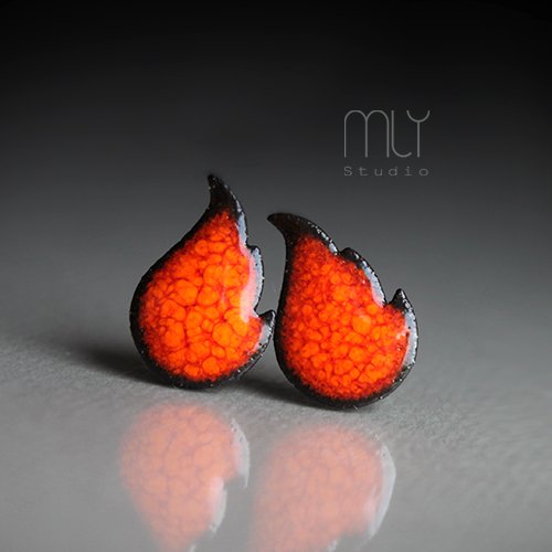 Oryginalne ceramiczne kolczyki w formie sztyftów, ręcznie wykonane z delikatnej kamionki, jednostronnie szkliwione pomarańczowym szkliwem z efektem drobnych plamek, na antyalergicznych sztyftach w kolorze srebrnym. Długość ok 17mm. Polecam