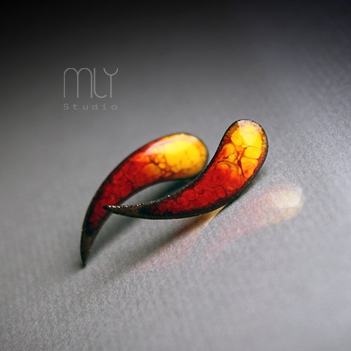 Ceramiczne podłużne kolczyki, ręcznie wykonane z delikatnej gliny kamionkowej, jednostronnie szkliwione mieszanką czerwonych i żółtych szkliw z efektem plamek, tył matowy czekoladowobrązowy na antyalergicznych sztyftach.długość ok 2,8cm. Polecam