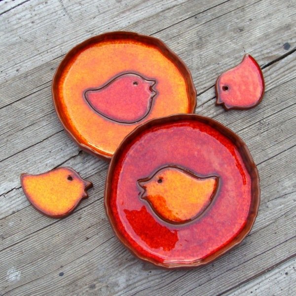 Zestaw 2 małych miseczek ceramicznych na torebki z herbatą lub na drobne słodycze albo inne drobiazgi 2 urocze ozdoby na magnes. Zapakowane w tekturowe pudełko, wyścielane siankiem drzewnym i przyozdobione ceramiczną ozdobą, przez co idaelnie nadają się na prezent. Wykonane z brązowej gliny, pokryte wewnątrz błyszczącymi szkliwami efektowymi w soczystych kolorach, a zewnątrz szkliwem transparentnym. Wymiary: talerzyki - średnica ok. 10 cm, wysokość - ok. 1,5 cm; ptaszki - ok. 5 x 3,5 cm. Polecam serdecznie.