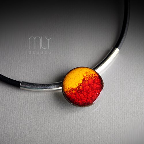 Efektowny ceramiczny wisior, ręcznie wykonany z mocno spieczonej czekoladowobrązowej gliny kamionkowej, jednostronnie szkliwiony mieszanką czerwonych i żółtych szkliw z efektem plamek, tył surowy,ciemnobrązowy, zawieszony na grubym rzemieniu jubilerskim z zapięciem w kolorze srebrnym. Średnica elementu ceramicznego około 27mm, obwód linki ok 44cm (plus 10cm łańcuszka regulacyjnego). Polecam. Termin realizacji zamówienia to 1-2 dni.