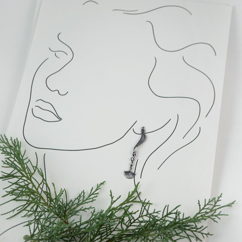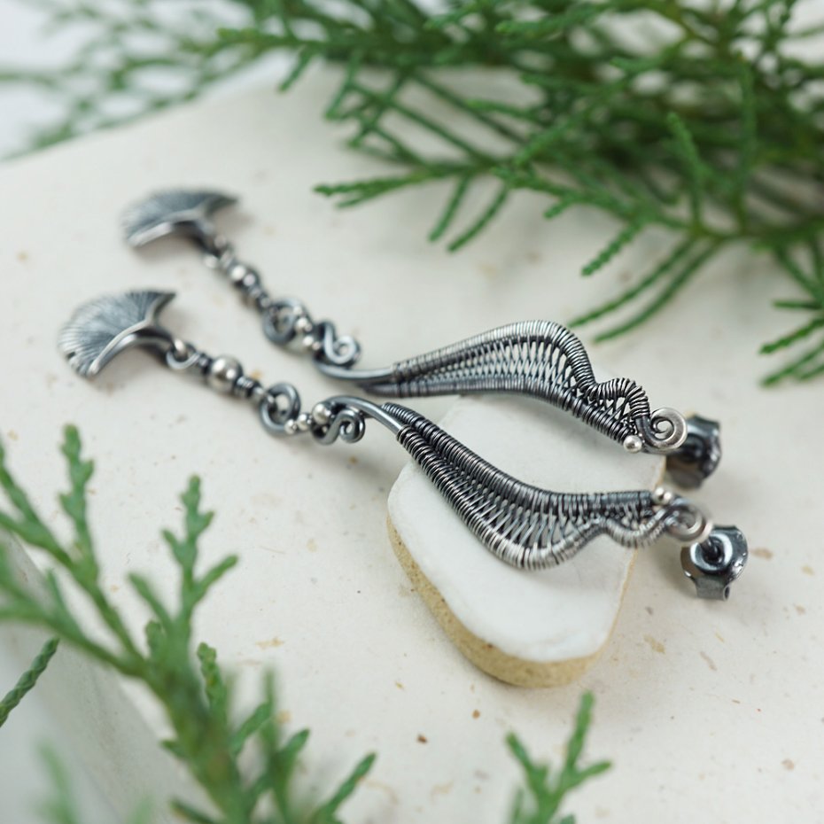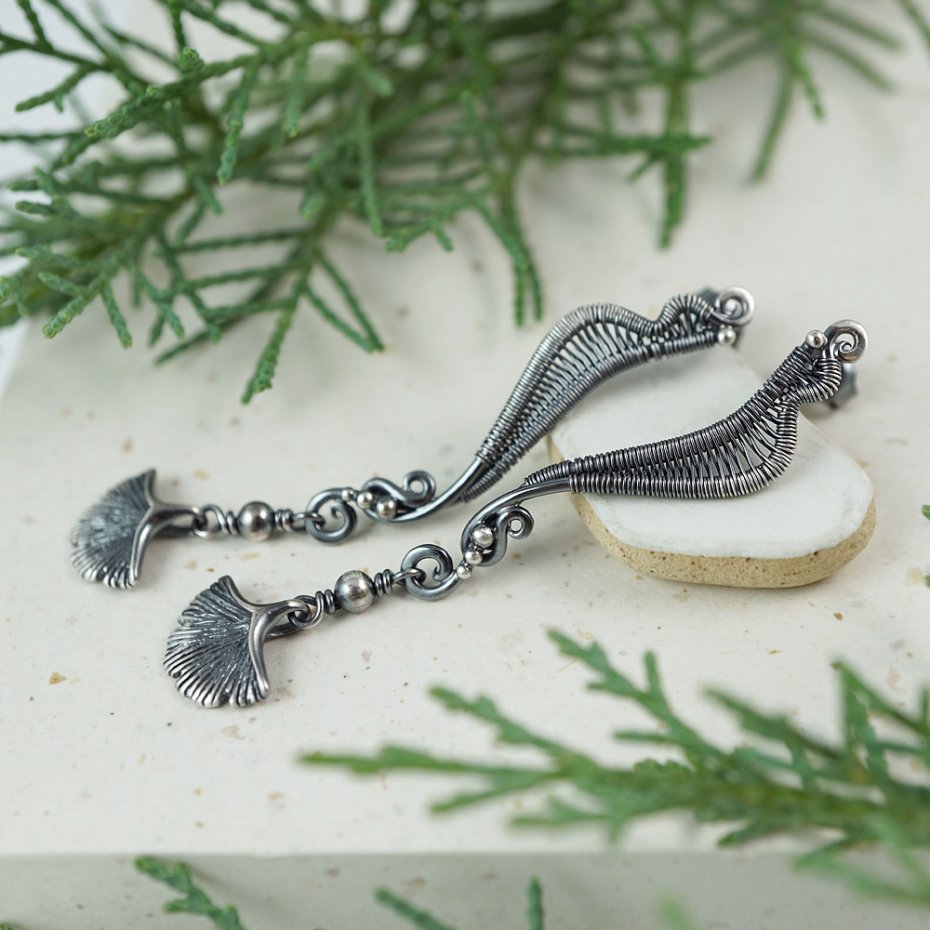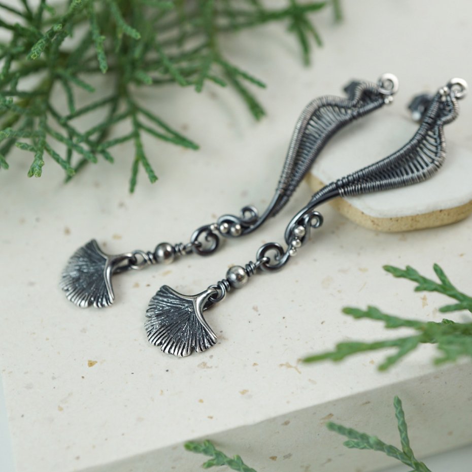 Subtelne, smukłe kolczyki-sztyfty o fantazyjne formie, zwieńczonej kołyszącymi się w ruchu srebrnymi listkami miłorzębu.