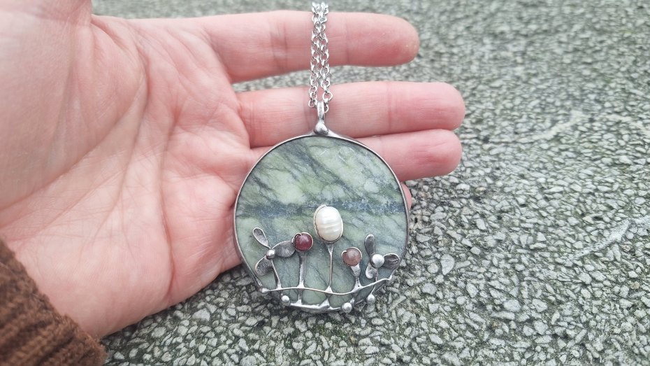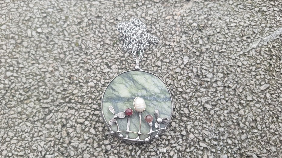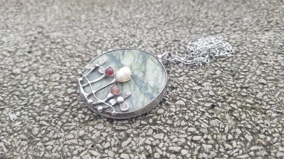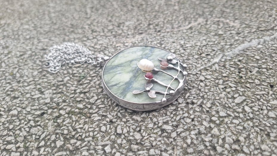 Wisiorek wykonany z miedzi, cyny, jadeitu, turmalinu, granatu i perły. Wymiary ok. 5 na 5 cm. Zawieszony na łańcuszku o długości ok. 50 cm.