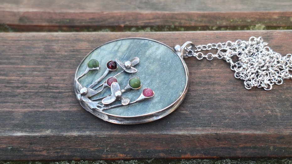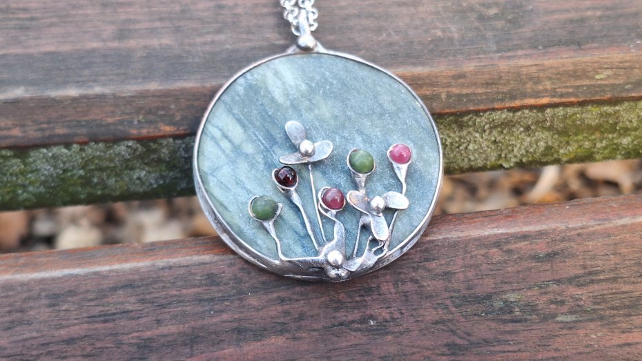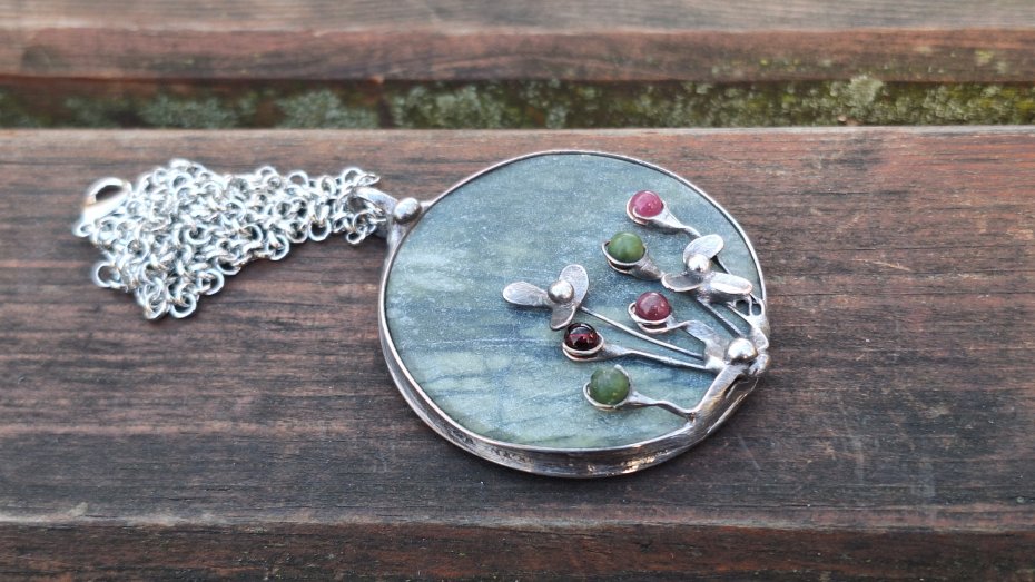 Wisiorek wykonany z miedzi, cyny, jadeitu, turmalinów. Wymiary ok. 5 na 5 cm. Zawieszony na łańcuszku o długości ok. 50 cm.