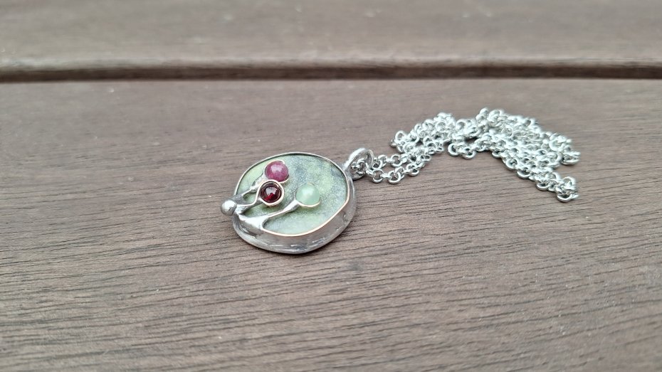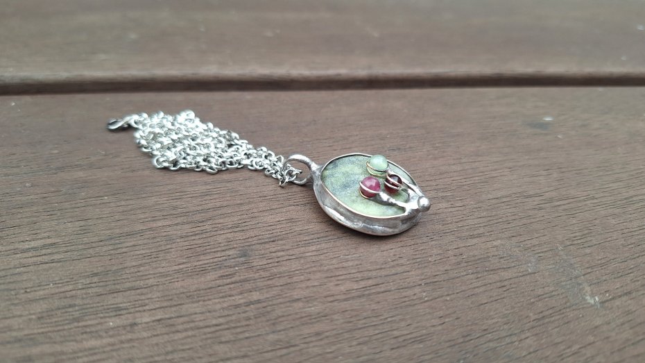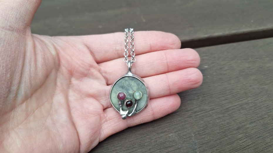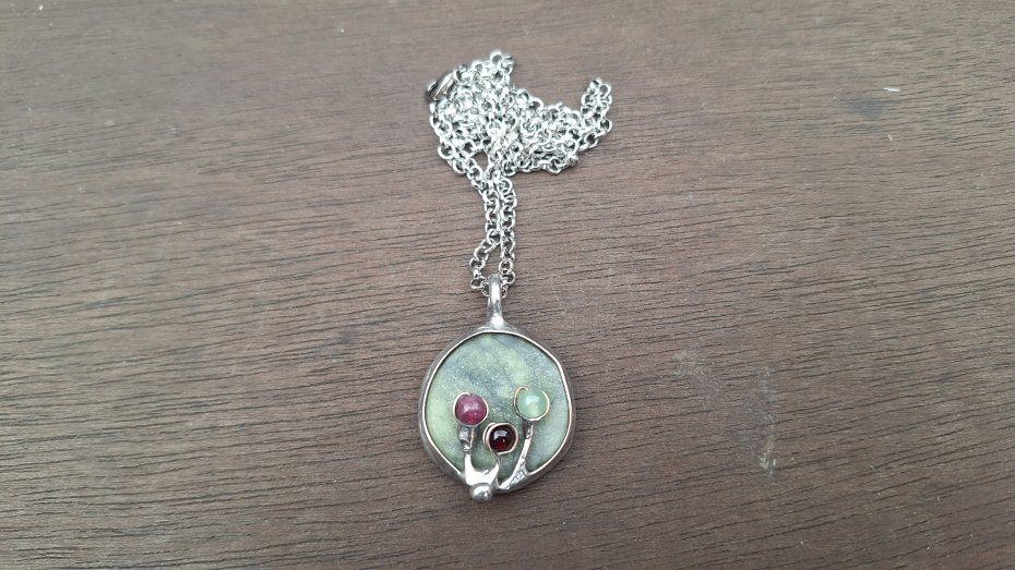 Wisiorek wykonany z miedzi, cyny, jadeitu, turmalinu, granatu. Wymiary ok. 2.5 na 2.5 cm. Zawieszony na łańcuszku o długości ok. 50 cm.