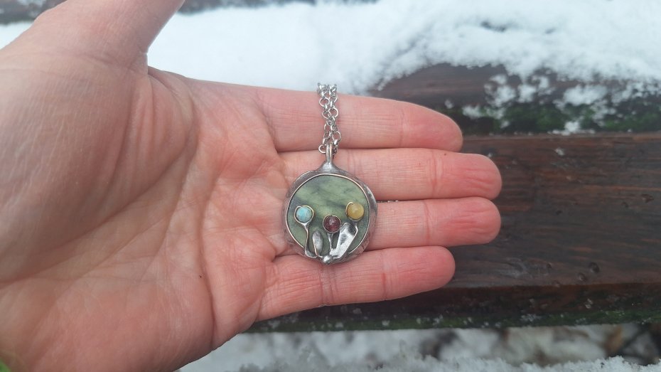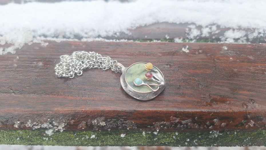 Wisiorek wykonany z miedzi, cyny, jadeitu, turmalinów, amazonitu. Wymiary ok. 2.5 na 2.5 cm. Zawieszony na łańcuszku o długości ok. 50 cm.