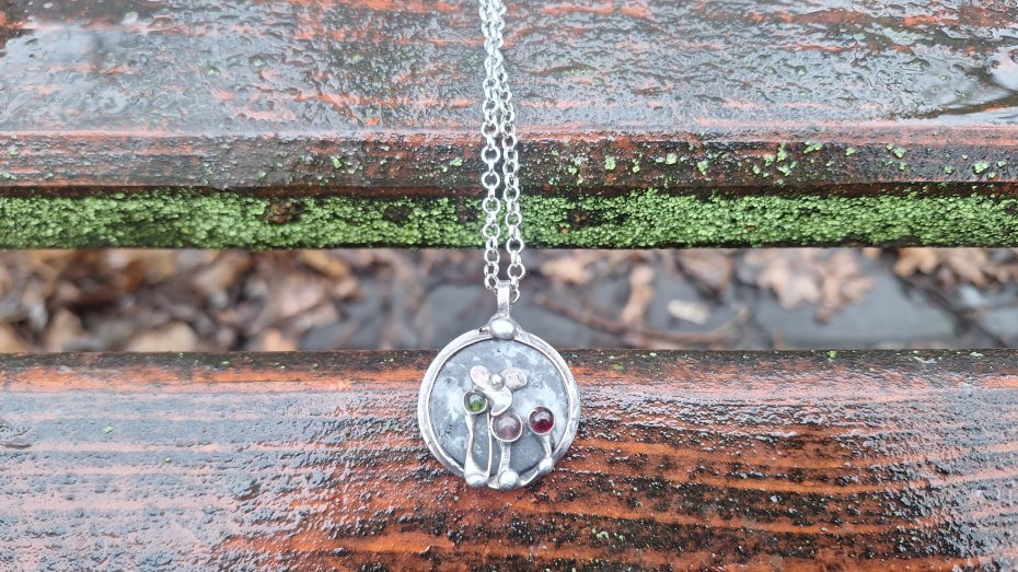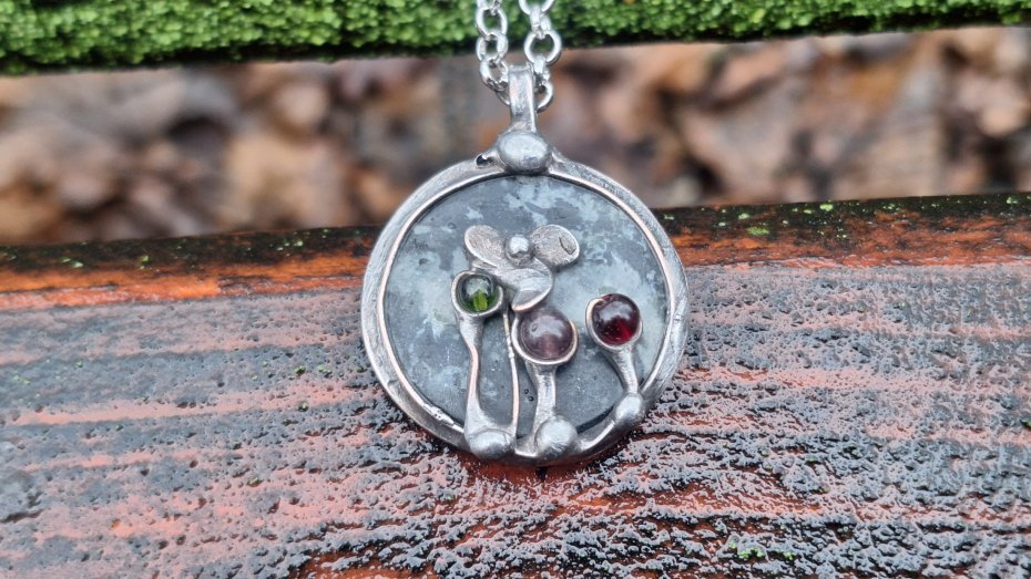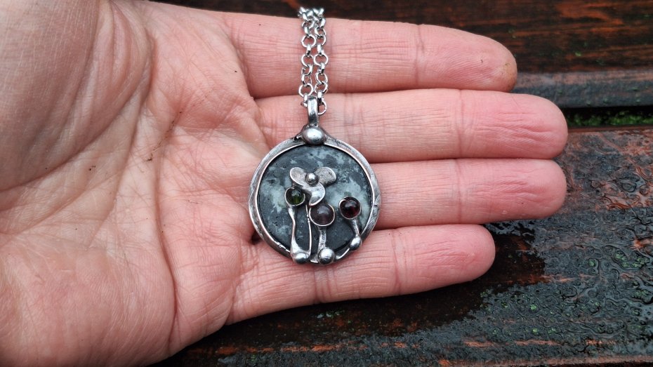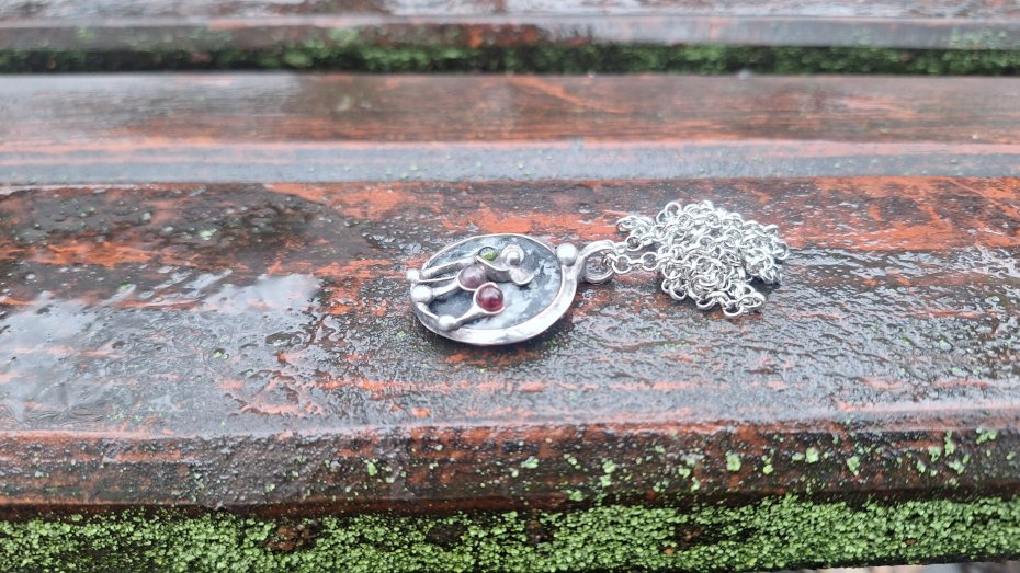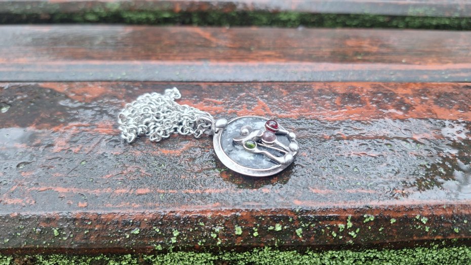 Wisiorek wykonany z miedzi, cyny, agatu i turmalinów. Wymiary ok. 2.7 na 2.7 cm. Zawieszony na łańcuszku o długości ok. 50 cm.